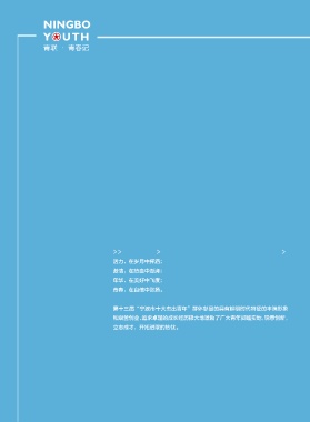 青联 c 青春记 活力,在岁月中挥洒; 激情,在热血中澎湃; 年华,在美好中飞度; 青春,在自信中张扬。 第十三届“宁波市十大杰出青年”群体彰显的具有鲜明时代特征的丰满形象 和艰苦创业、追求卓越的成长经历极大地激励了广大青年脚踏实地,锐意创新, 立志成才,开拓进取的热忱。